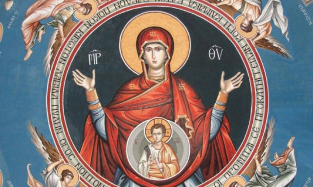 Τείχος εί τών Παρθένων, Θεοτόκε Παρθένε, καί πάντων τών εις σέ προστρεχόντων, ο γάρ τού ουρανού καί τής γής, κατεσκεύασέ σε Ποιητής Άχραντε, οικήσας εν τή μήτρα σου, καί πάντας σοι προσφωνείν διδάξας,