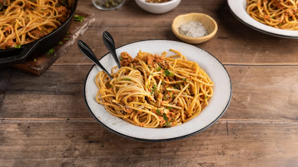 Μια μερίδα μακαρόνια με τόνο και μια σαλάτα με λάχανο καρότο και μια κουταλιά λαδολέμονο