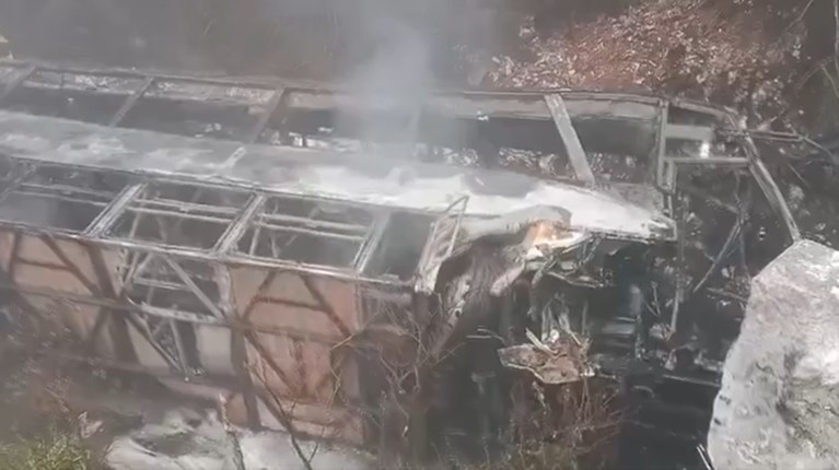 Σύμφωνα με την υπηρεσία άμεσης βοήθειας ECU911, το λεωφορείο βγήκε από τον δρόμο κι έπεσε σε χαράδρα προτού πάρει φωτιά.