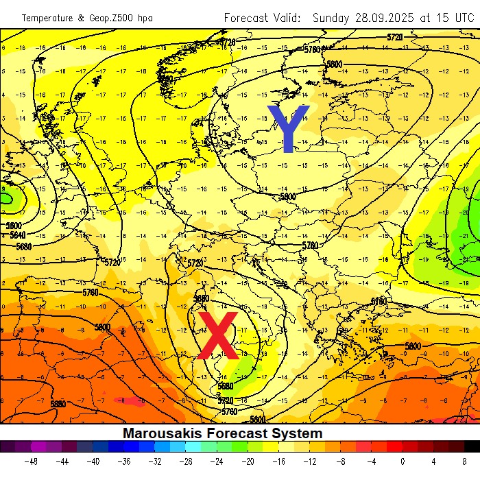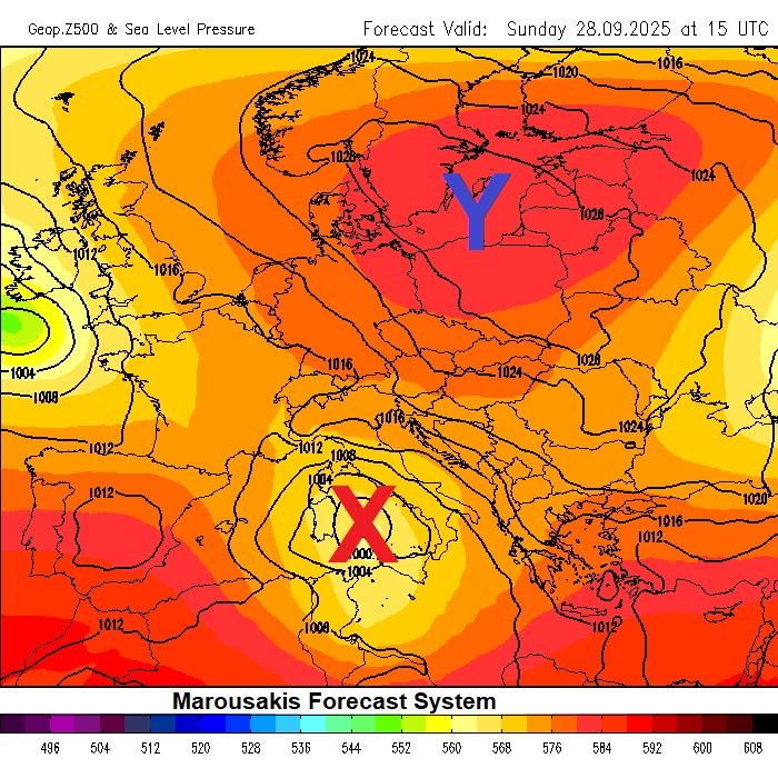 Από την άλλη με το γράμμα “Χ” παρατηρούμε το βαρομετρικό χαμηλό νοτιότερα αυτού του αντικυκλώνα. Ο συνδυασμός αυτών των δύο βαρομετρικών συστημάτων οδηγεί ψυχρό αέρα στη μέση και ανώτερη τροπόσφαιρα προς το βαρομετρικό χαμηλό με αποτέλεσμα την ανατροφοδότησή του.