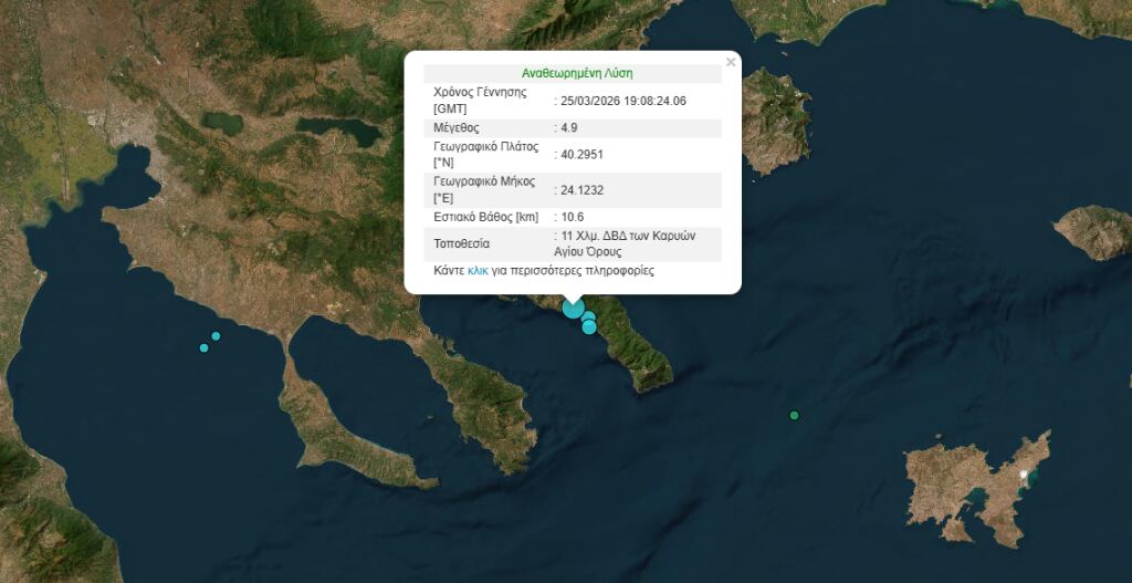 Ισχυρή σεισμική δόνηση 4,9 βαθμών της κλίμακας Ρίχτερ σημειώθηκε στις 21:08 το βράδυ της Τετάρτης 25 Μαρτίου, 8 χιλιόμετρα ΒΔ των Καρυών Αγίου Όρους.