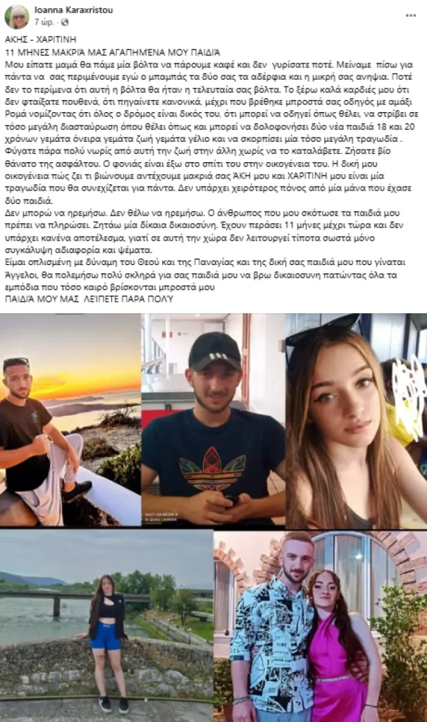 Η κυρία Καραχρήστου, σε ανάρτησή της στο Facebook θυμάται ότι στις 2 Νοεμβρίου 2024 τα δύο παιδιά της, ο 20χρονος Άκης και η 17χρονη Χαριτίνη, της είπανε πως θα πάνε βόλτα αλλά δεν γύρισαν ποτέ και «μείναμε πίσω για πάντα να σας περιμένουμε εγώ ο μπαμπάς τα δύο σας τα αδέρφια και η μικρή σας ανιψιά».