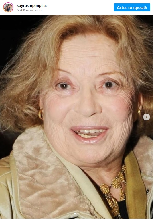 Πρόσφατα ολοκλήρωσε και το βιβλίο της ζωής της. Θα την αποχαιρετήσουμε την Τέταρτη 15 Οκτωβρίου στο Α’ κοιμητήριο της Αθήνας στις 11 το πρωί. Θερμά συλλυπητήρια στον φίλο μας, τον αγαπημένο της γιο, Χρήστο», έγραψε ο Σπύρος Μπιμπίλας.