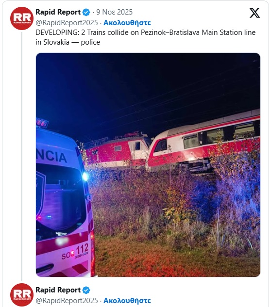 Συναγερμός έχει σημάνει στην Σλοβακία, όπου δύο τρένα συγκρούστηκαν κοντά στη Μπρατισλάβα, με τα τοπικά μέσα ενημέρωσης να μεταδίδουν ότι υπάρχουν πολλοί τραυματίες, εννιά από αυτούς σοβαρά, σύμφωνα με το aktuality.sk.